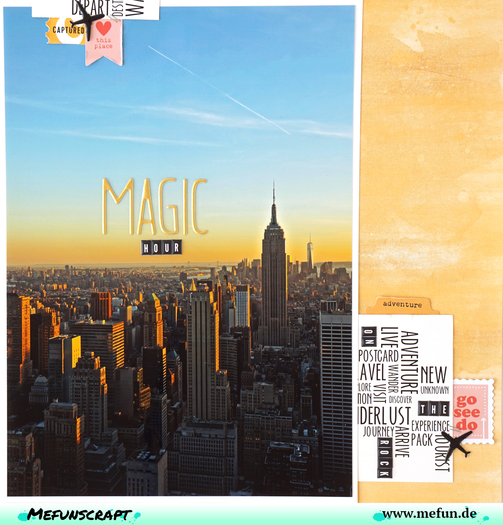 Hier gefiel mir das pinke Papier und auch das Papier hinter dem Foto nicht, außerdem waren mir die Buchstabensticker zu verspielt. Außerdem habe ich den Titel beim neuen Layout direkt ‚auf den Horizont geklebt‘ und so noch Platz für ein Embellishment-Cluster oben auf dem Layout gehabt. Das Journaling ist hinter der Karte rechts neben dem Foto versteckt.